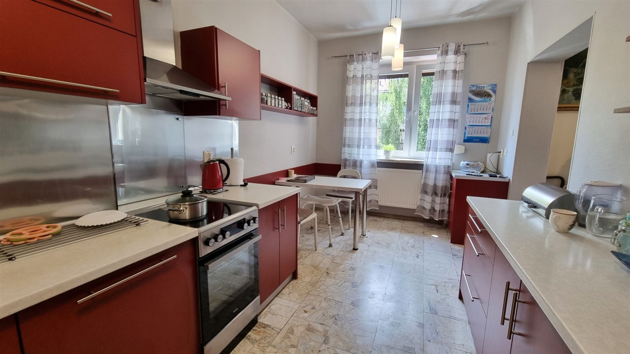 - KUCHNIA ok. 11 m, podłoga płytki marmur łamany, ściany panel z płyty stalowej, tapeta, okno PCV , roletki okienne + rolety zewnętrzne, meble kuchenne w zabudowie ze sprzętami AGD