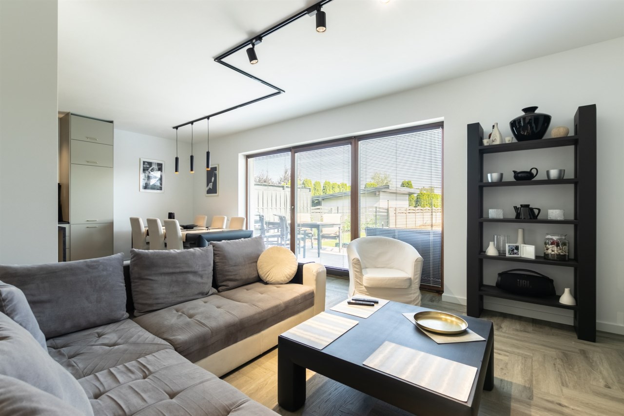 • przestronny salon z wyjściem na taras i ogród, połączony z kuchnią