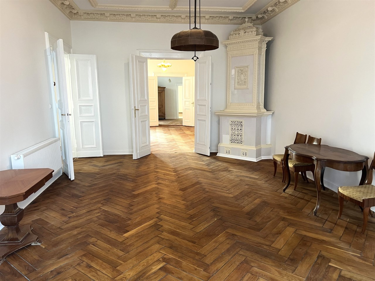 - POKÓJ FRONTOWY Z BALKONEM/SALON - opcja: 42,0 m², z balkonem od ul. Piotrkowskiej, z niego przejście przez duże podwójne drzwi do holu i do pokoju przejściowego, w pokoju ozdobny piec kaflowy, oryginalne wykończenia sufitów,