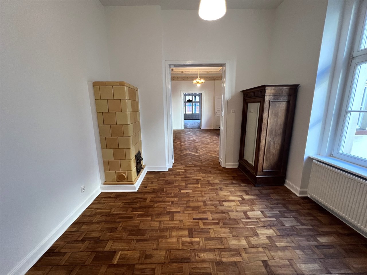 - POKÓJ ŚRODKOWY/ANEKS KUCHENNY - opcja: 34,8 m², w pokoju ozdobny piec kaflowy, oryginalne wykończenia sufitów, okno na podwórko, z niego przejście przez duże podwójne drzwi do małego pokoju przejściowego - UWAGA: