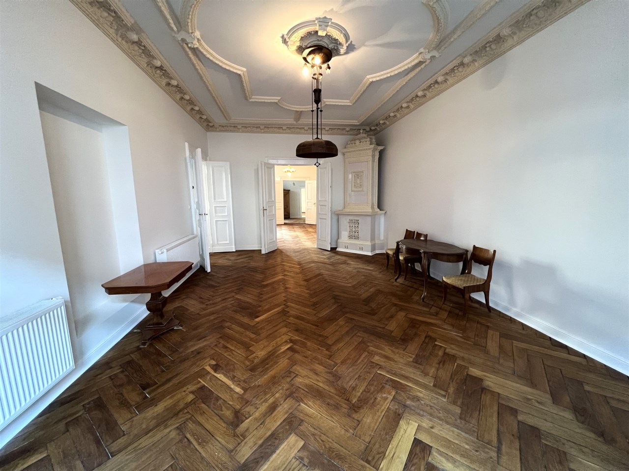 - POKÓJ FRONTOWY Z BALKONEM/SALON - opcja: 42,0 m², z balkonem od ul. Piotrkowskiej, z niego przejście przez duże podwójne drzwi do holu i do pokoju przejściowego, w pokoju ozdobny piec kaflowy, oryginalne wykończenia sufitów,