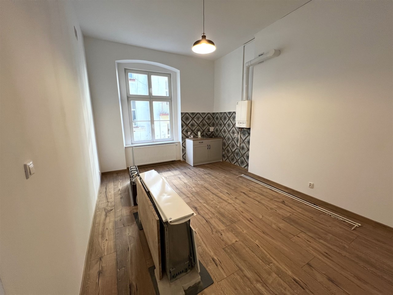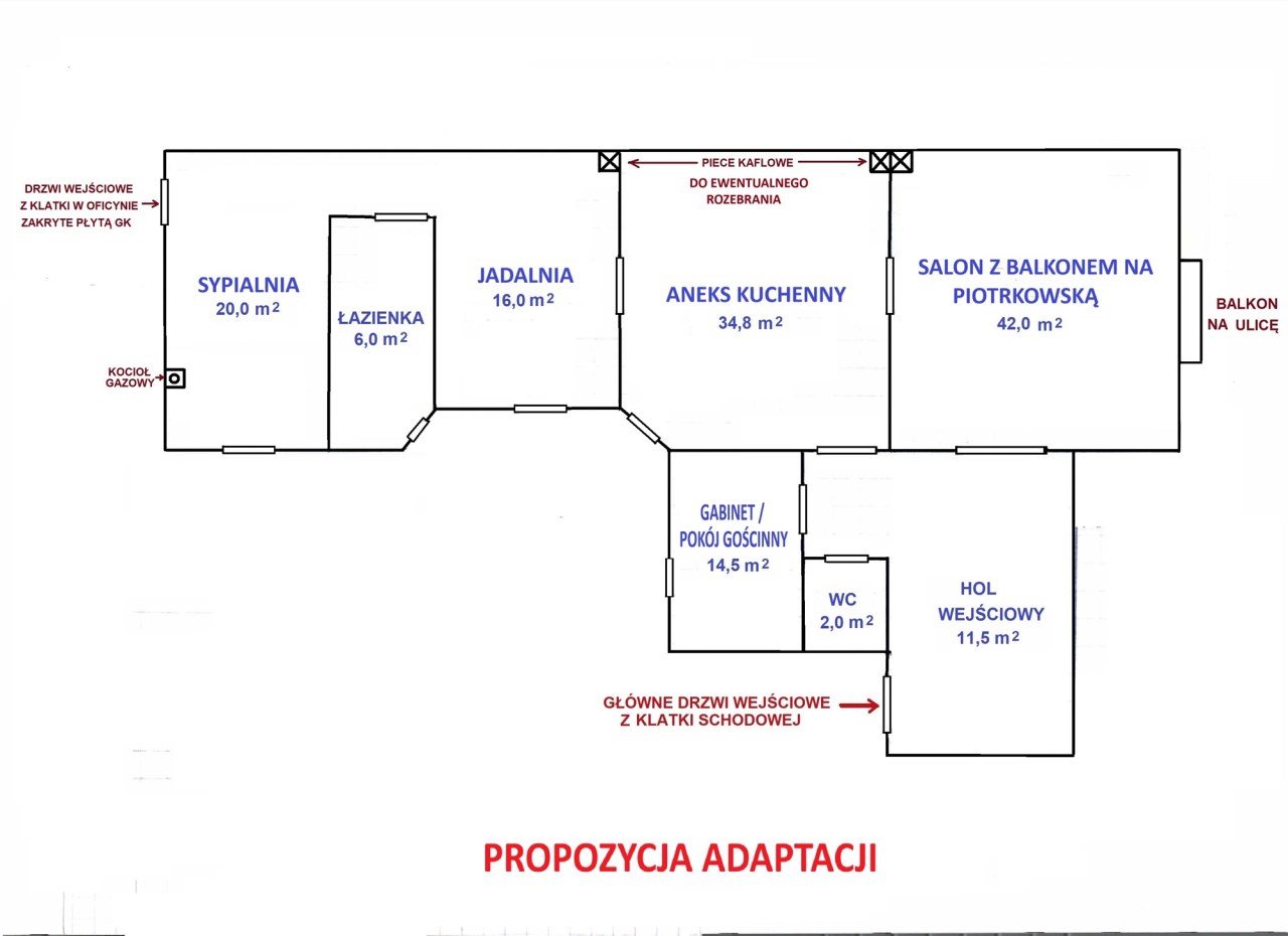 - KUCHNIA/SYPIALNIA - opcja: 21,8 m², okno na podwórze, w kuchni 2-funkcyjny piec gazowy do celów grzewczych i do ciepłej wody użytkowej, wyjście na klatkę schodową w oficynie obecnie zasłonięte płytą gipsowo-kartonową - do ewentualnego odtworzenia,