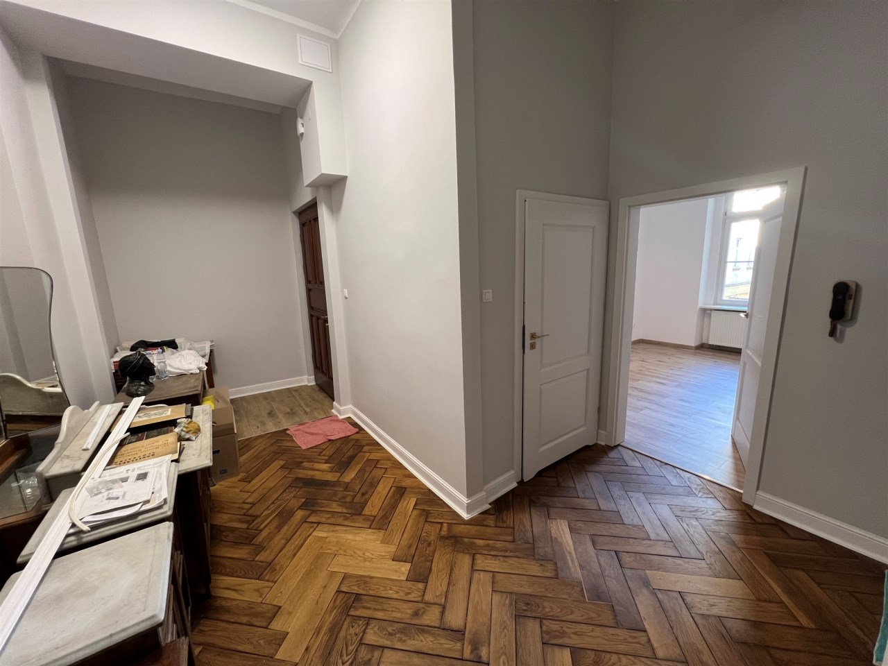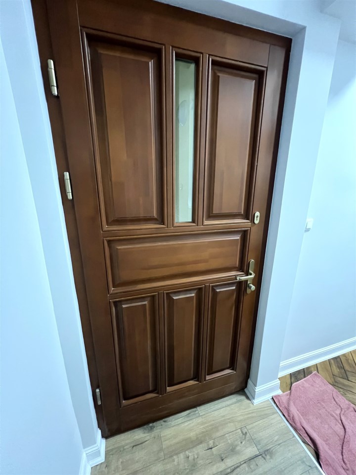 - DRZWI: zewnętrzne drzwi wejściowe antywłamaniowe, drzwi wewnętrzne w większości oryginalne, po usunięciu starej farby, pomalowane na nowo, w części pomieszczeń założone nowe drzwi w stylu nawiązującym do drzwi oryginalnych,