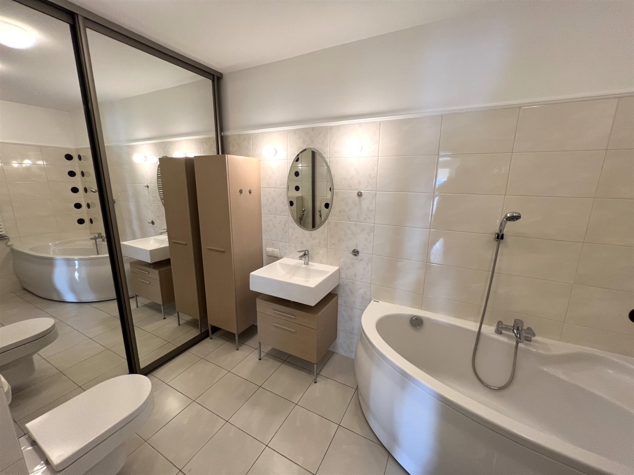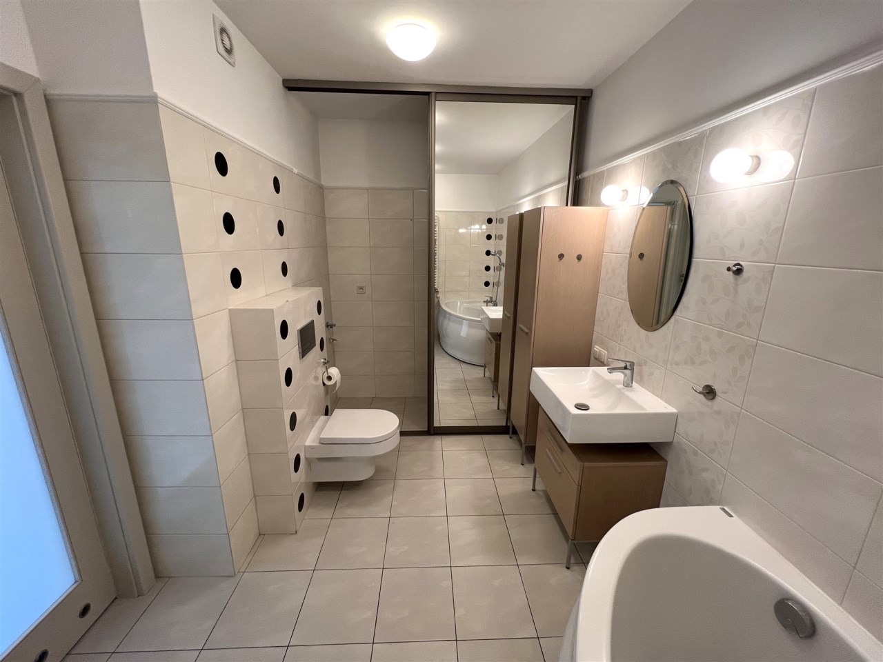 - ŁAZIENKA I, z wanną i prysznicem: 12,44 m², obok głównej sypialni, z wanną narożną i kabiną prysznicową, pralnia oddzielona drzwiami przesuwnymi z lustrem, przygotowane podłączenie pralki oraz słuchawka bidetowa,