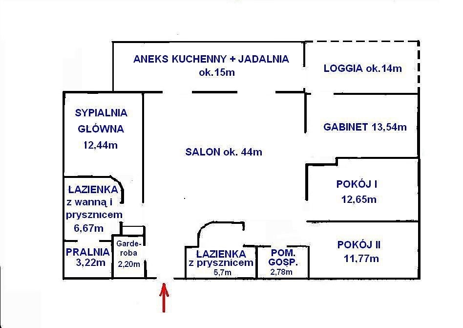 - ROZKŁAD: pełen rozkład, salon jest centralną częścią apartamentu z niego wejścia w zasadzie do wszystkich pomieszczeń,