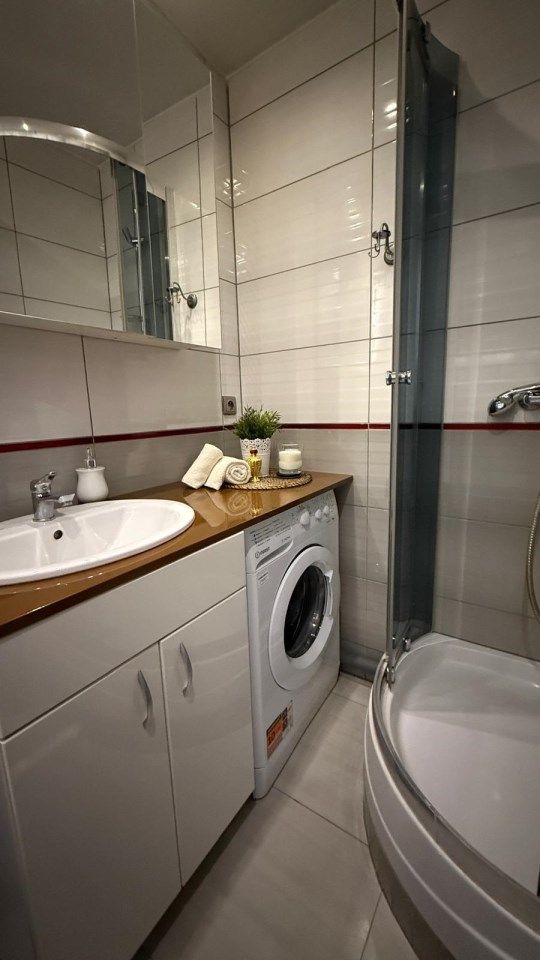 ŁAZIENKA z WC- kabina prysznicowa, umywalka, szafka na kosmetyki, pralka