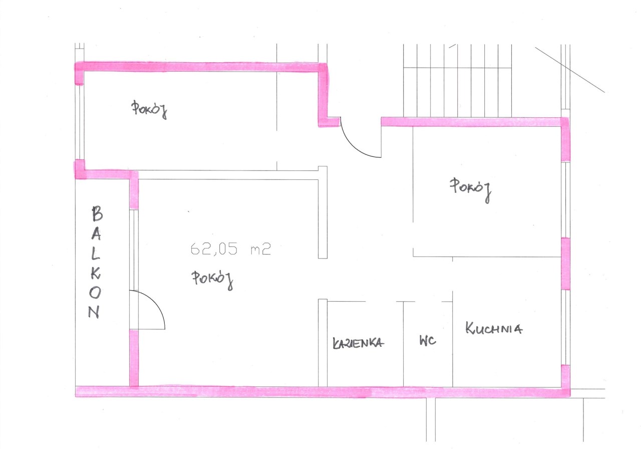 W pełni rozkładowe mieszkanie o powierzchni 62,05 mkw składające się z trzech pokoi, kuchni, łazienki, wc i przedpokoju oraz balkonu, położone na 4 piętrze w bloku z lat 80-tych. Właściciel lokalu ma możliwość korzystania z piwnicy. Mieszkanie w stanie technicznym do generalnego remontu. Okna drewniane, jedno okno PCV. Mieszkanie nieumeblowane. W przedpokoju miejsce na dużą szafę lub garderobę.