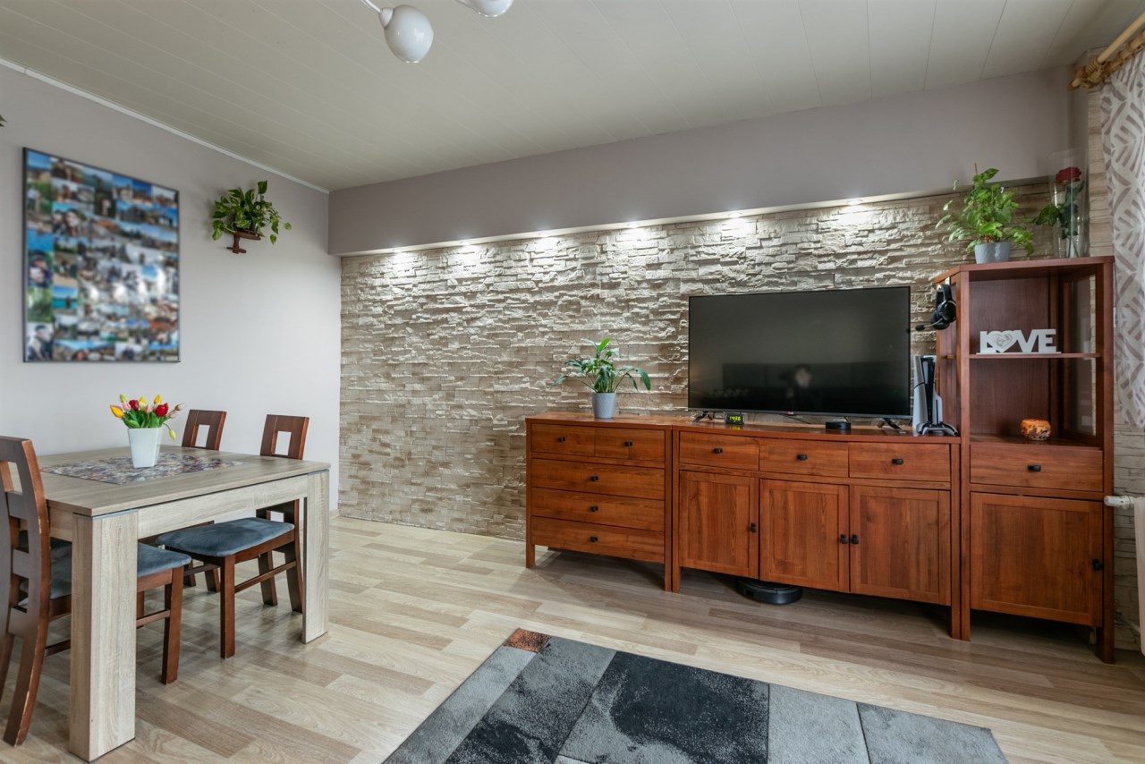 W mieszkaniu ściany - gładź malowana, kamień ozdobny, podłogi panele.
