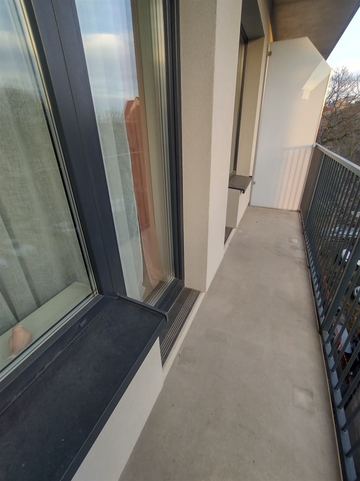 Spory balkon przez całą szerokość salonu i sypialni, w terakocie.
