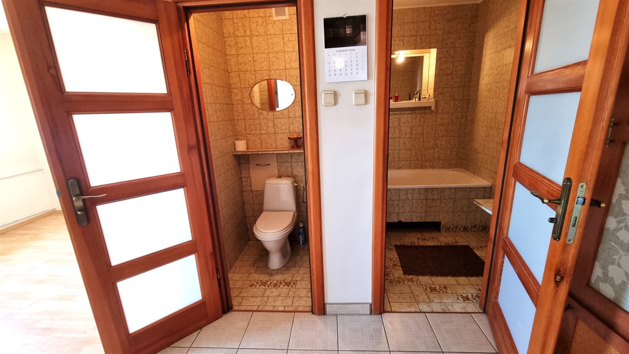 WC osobno, starsza glazura i terakota, sedes, umywalka, nowoczesne drzwi drewniane z przeszkleniami