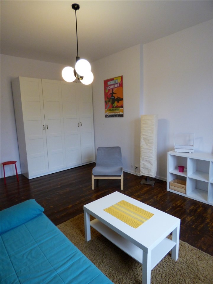 POKÓJ ok. 20m, na podłodze odnowione deski, ściany - gładzie, meble: kanapa, fotel, stolik, szafa, regał.