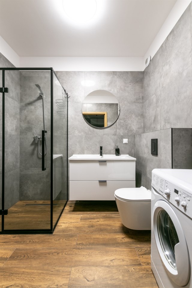 Wyposażenie łazienki pralka, prysznic, umywalka, WC